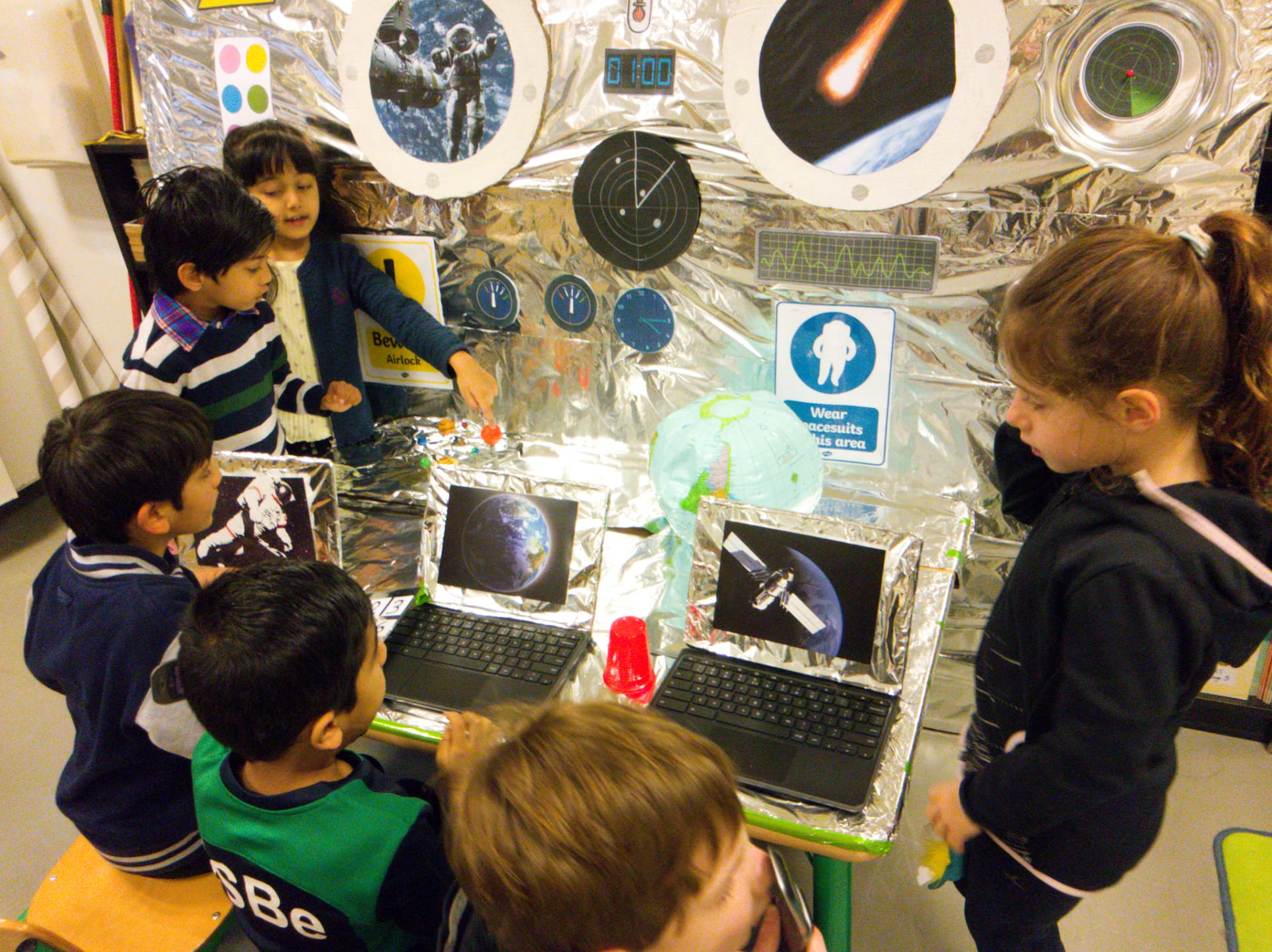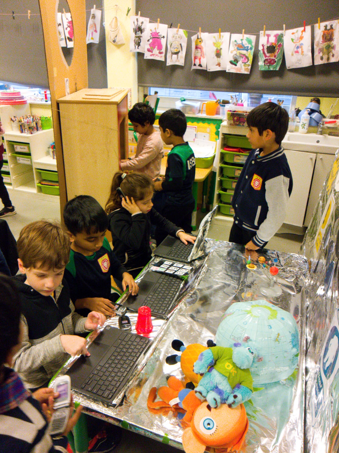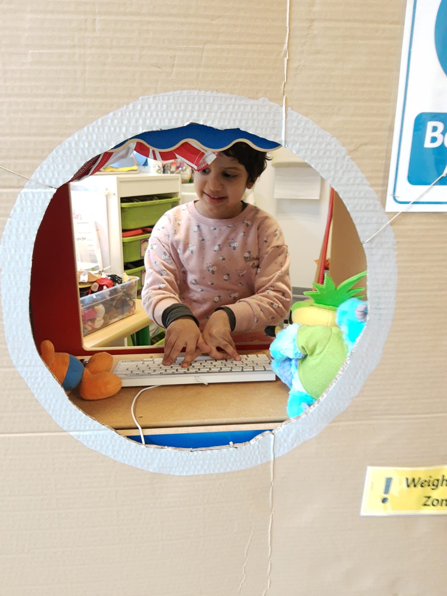 The children this morning found in the corridor a mysterious trail of space debris, including a map of the cosmos, that led towards the classroom. They discovered, once bursting into the room, that a space ship had made an emergency landing there! On board were 3 aliens who needed help to return to their planet. The children had a mission to fix the space ship and help the aliens. They set about brainstorming possible destinations and made lists of essential items to pack for the journey. These included a comb, picnic basket, and space goggles! The children also examined ‘moon rocks’ whilst wearing special space gloves! It was a fun day and a great start to our Blast off! IEYC Topic.