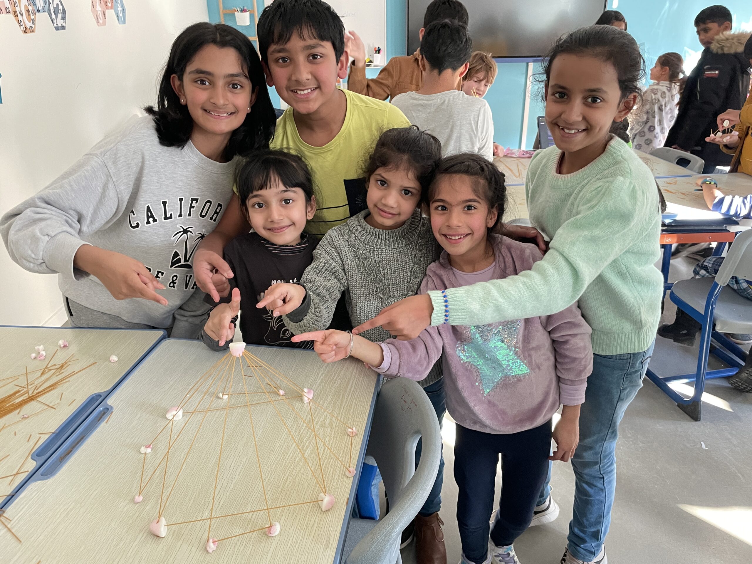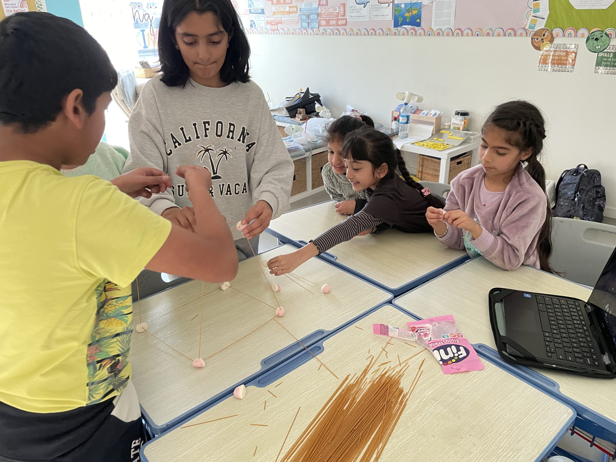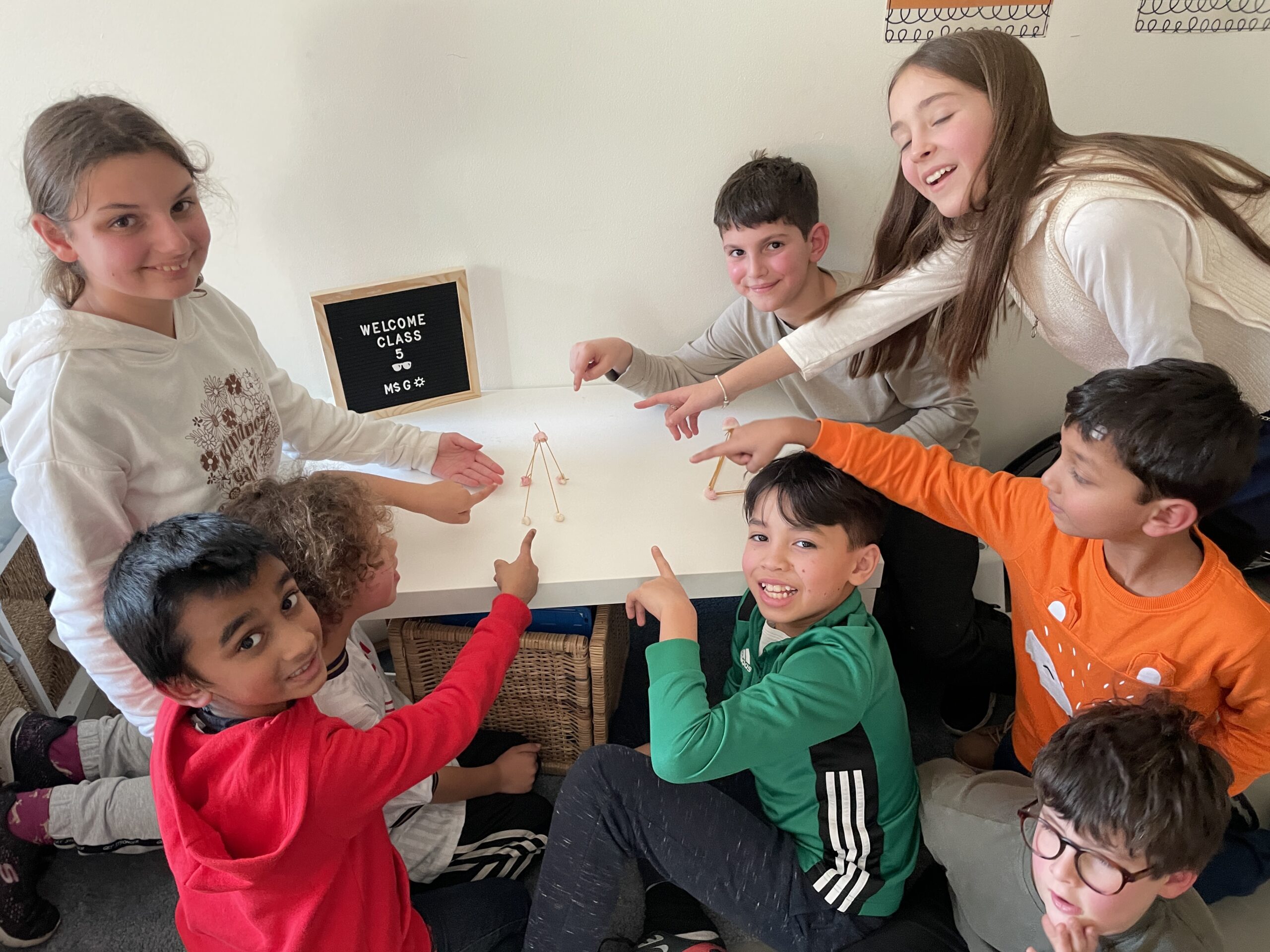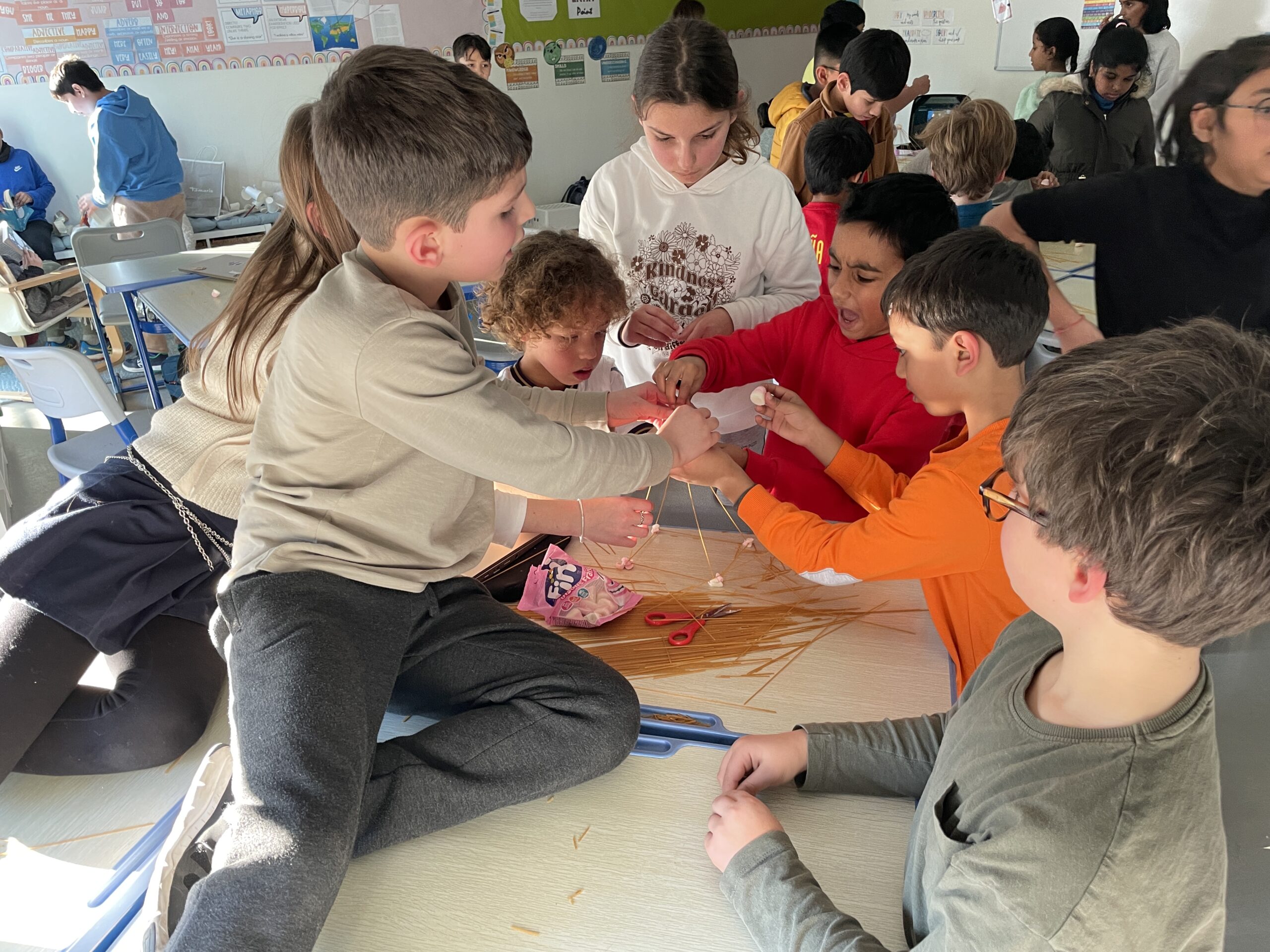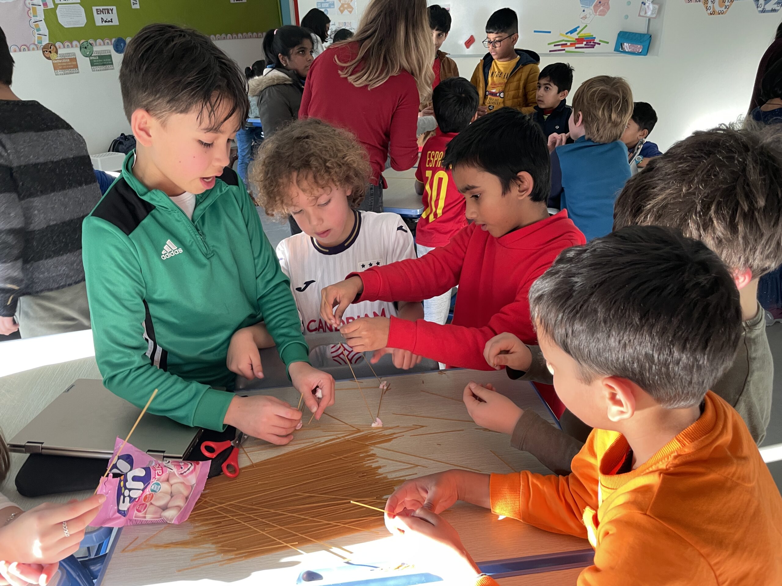 This week the students from class 1 and 5 collaborated on a team building activity. Collaboration helps children to discover each others’ strengths, interests and capabilities. Instead of limiting learning to a one way stream from a teacher or an adult to them, they can learn from each other. As a result each child can develop a unique set of skills and knowledge in a fun and efficient way. Here you can see Class 1 working along with Class 5 on a team building project where they are using spaghetti and marshmallows to make structures.