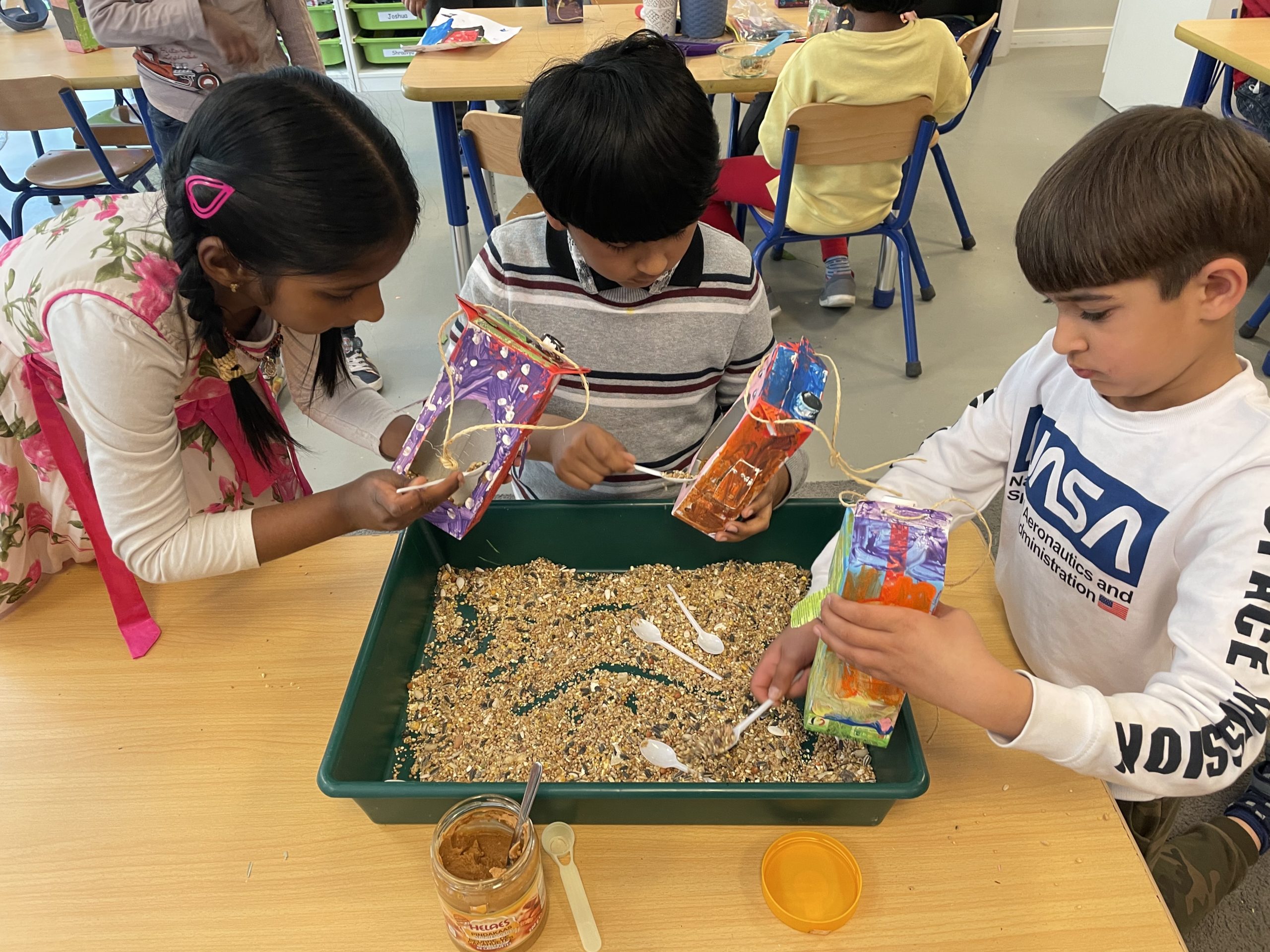 The children in class 1 have been learning all about our world. They were introduced to the beginning of the Universe through the story of the Big Bang Theory. The children then made their own cosmic address book. The purpose of this activity was to teach our children how a place exists within a larger place. It is an illustration and reinforcement of the concept of a child’s place in the universe and geographic location. We then moved on to learn about our planet Earth, the continents, landmarks, habitats and some interesting facts about our each continent. We also spoke about Earth Day, the aim of it, the consequences of climate change and what the children can do at home to help our planet. The children made a drawing of a person hugging our planet Earth through an instructional drawing activity. The students also did a tree hunt by identifying leaves. Next we discussed the importance of birds on our planet. This week we made bird feeders. The students loved making those and took them home to hang in their garden or balcony! They love learning about our world!
