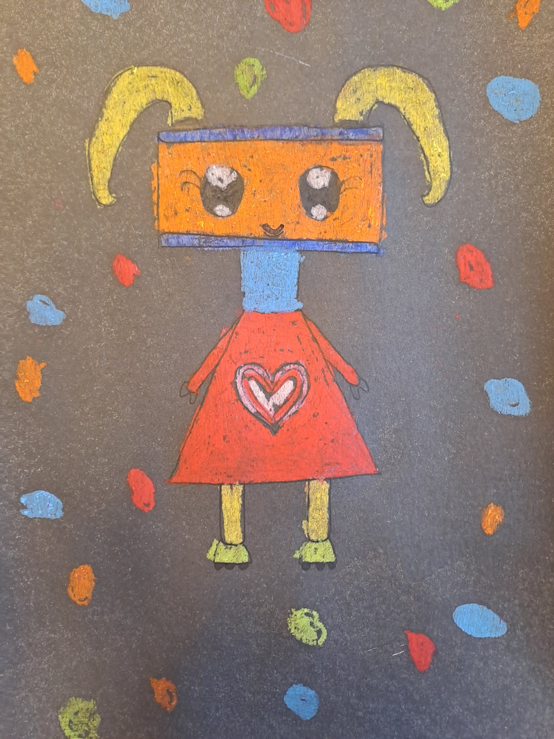 Class 4: Pixel Mosaic inspired by the artist “Invader”, Texture painting: Funny boots theme, Robot design: Understanding symmetry