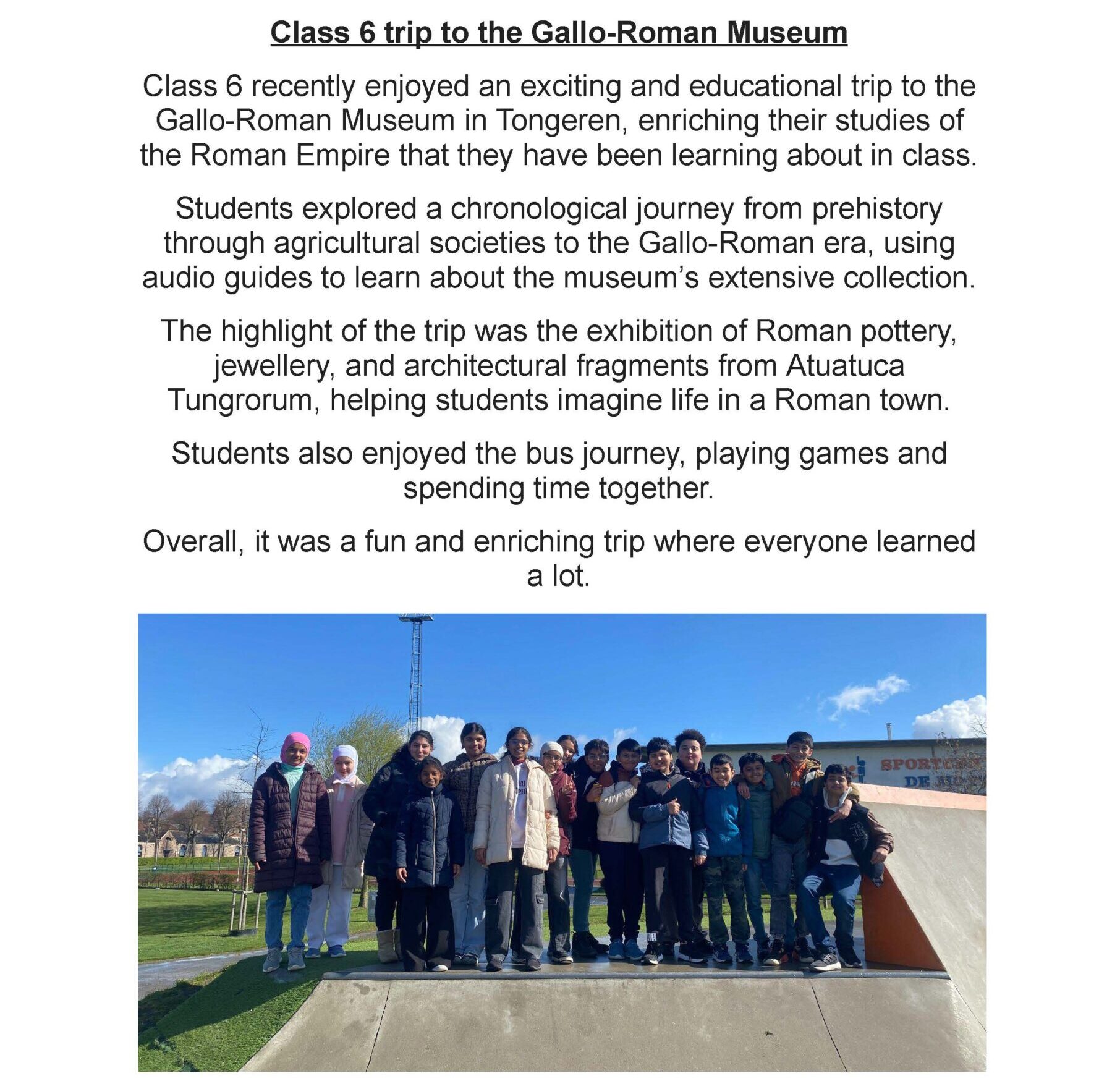 Students have also benefited from a range of enriching educational visits. Class 11 enjoyed a French trip to the Red Star Museum in Brussels, while Class 6 visited the Gallo-Roman Museum, both providing valuable cultural and historical learning experiences.