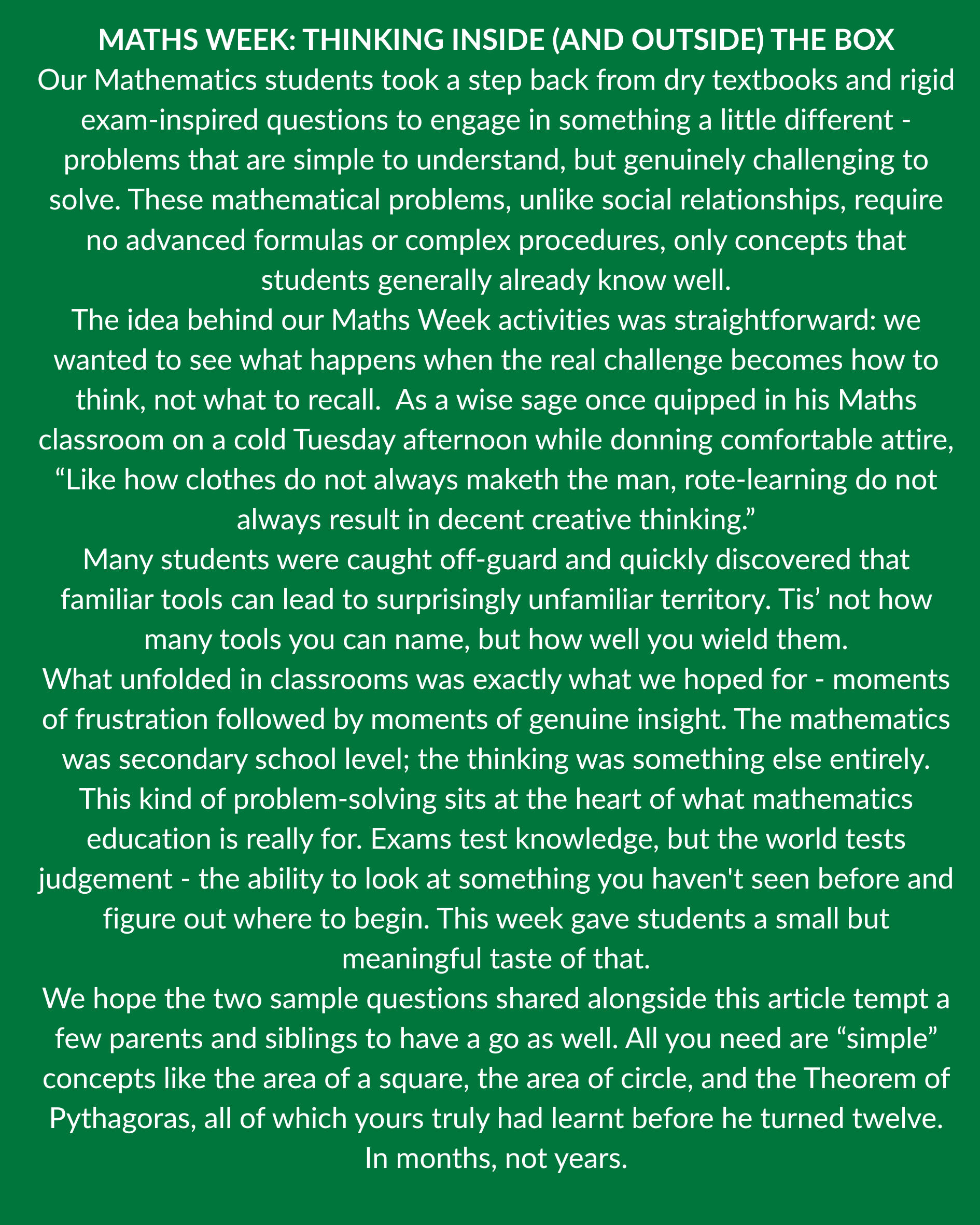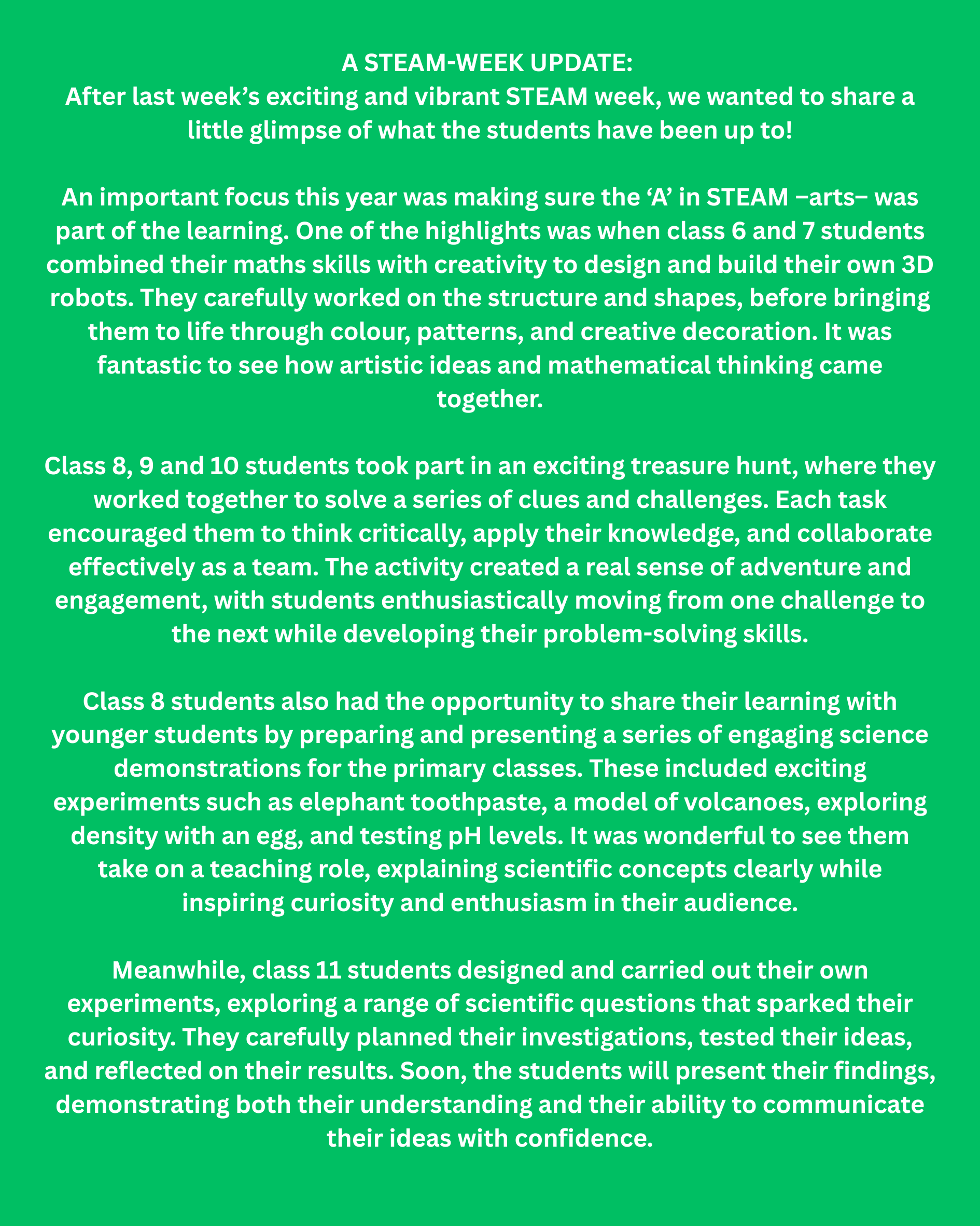 Coding was integrated into ICT lessons, while Mathematics lessons featured a range of engaging and interactive games. I would like to extend my thanks to all colleagues in Science, Technology, Art, and Mathematics for their contributions to a highly successful week.