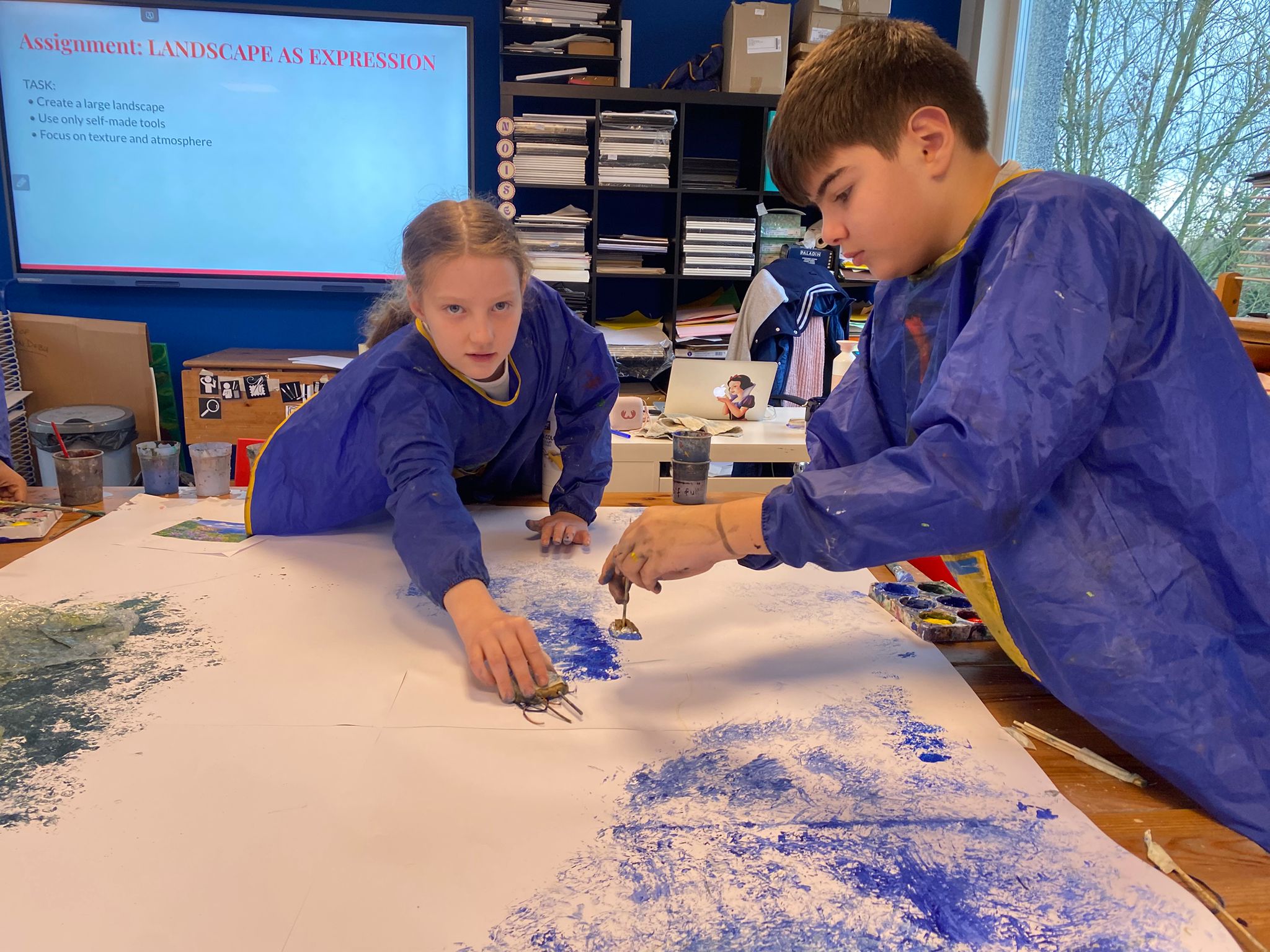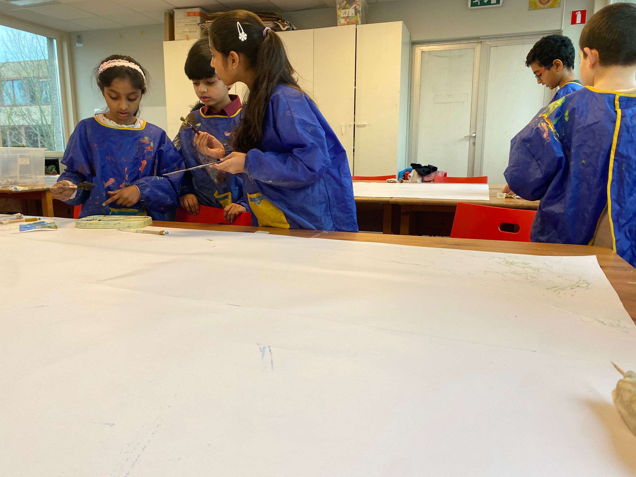 Art with Class 5 has been full of imagination, exploration and making this term. We travelled through the galaxy, explored emotions through expressive portraits inspired by Marlene Dumas, and discovered the flowing lines and nature-inspired designs of the Art Nouveau period. In our current project, Making Materials, the class has been travelling the world and its history through art. Pupils explored textiles and weaving inspired by Anni Albers and Aboriginal traditions, and looked at artists such as Sheila Hicks, Giuseppe Penone and William Kentridge, discovering how artists use natural, recycled and unexpected materials to tell stories. In today’s lesson, everyone worked together on a large-scale landscape using tools they had made themselves. Inspired by Anselm Kiefer, pupils experimented with texture, layers and bold mark-making to create a dramatic shared artwork. Class 5 has shown fantastic curiosity, teamwork and creativity, learning that art is not just about the final result, but about experimenting, discovering and enjoying the process.