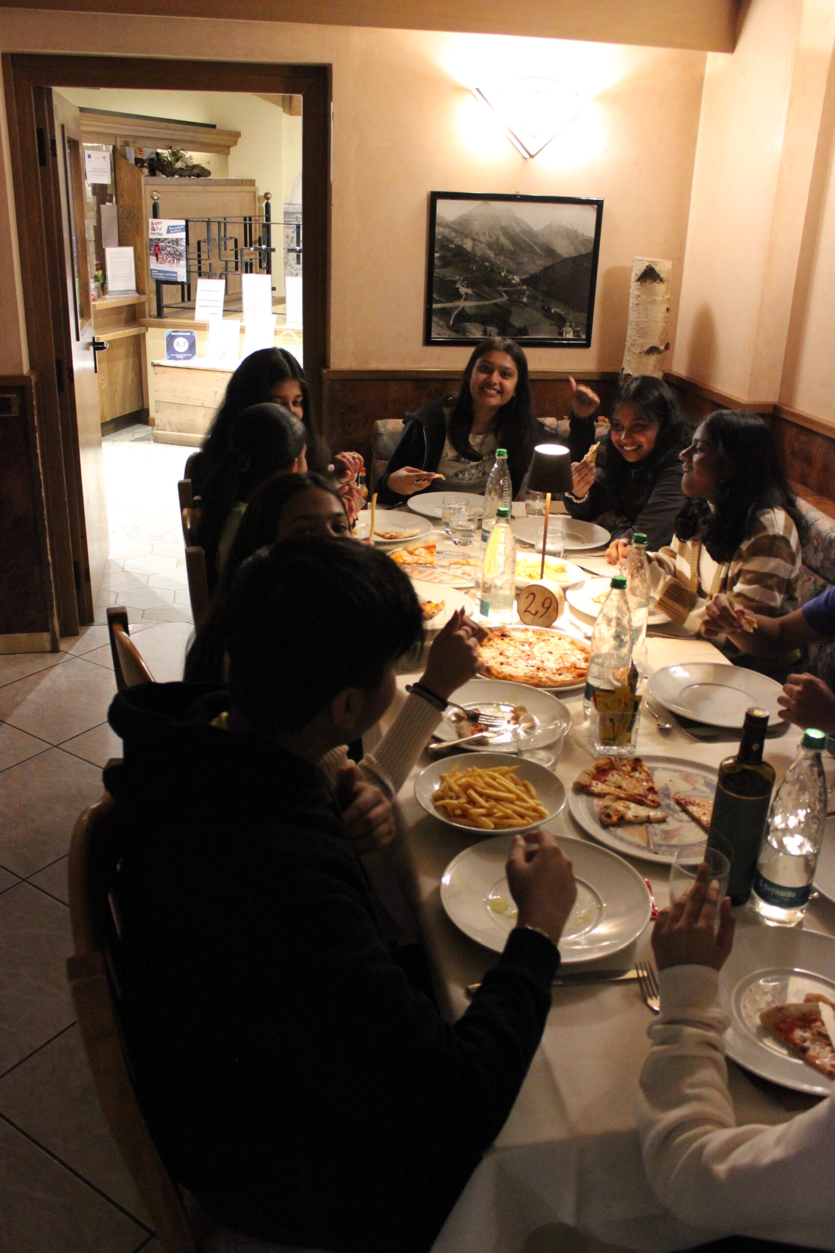 Monday brought a similar routine, but with a delightful twist—an indoor and outdoor heated swimming pool boasting extraordinary views. Tuesday and Wednesday saw us ascending to the 3000 m mark of Bormio, where our newfound confidence faced the ultimate test on previously labelled unconquerable slopes. Tuesday wrapped up with a laid-back movie night, while Wednesday’s highlight was a glam pizza and dance party, showcasing our fanciest moves.