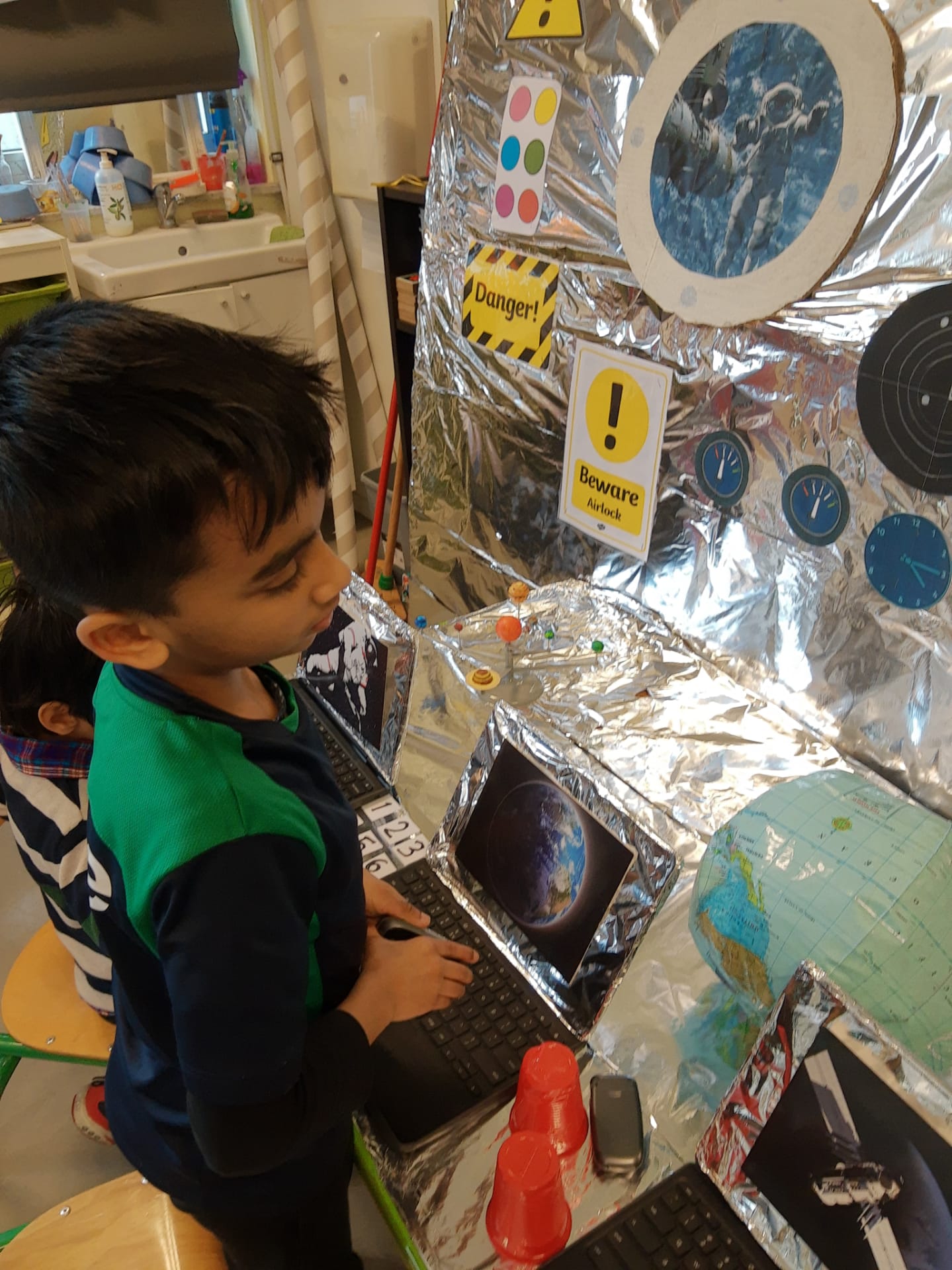 The children this morning found in the corridor a mysterious trail of space debris, including a map of the cosmos, that led towards the classroom. They discovered, once bursting into the room, that a space ship had made an emergency landing there! On board were 3 aliens who needed help to return to their planet. The children had a mission to fix the space ship and help the aliens. They set about brainstorming possible destinations and made lists of essential items to pack for the journey. These included a comb, picnic basket, and space goggles! The children also examined ‘moon rocks’ whilst wearing special space gloves! It was a fun day and a great start to our Blast off! IEYC Topic.
