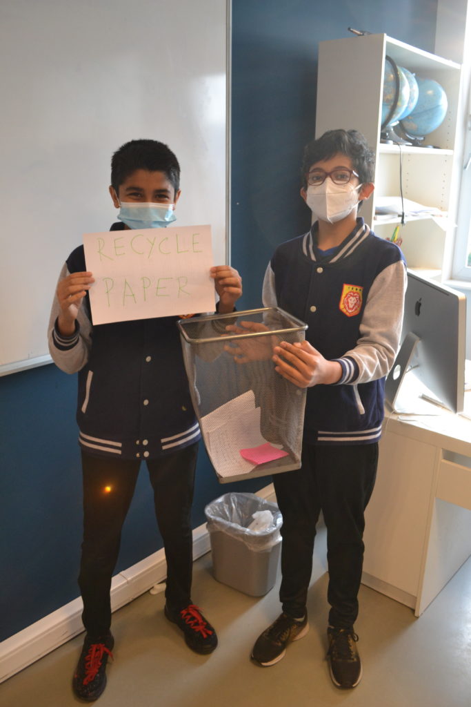 Most students say that the school is being environmentally friendly because we have dustbins in each classroom for general waste and the other for paper. Also, when the teachers print something wrong or printed too much we would put it in the scrap paper box instead of throwing it away. The teachers also try to use as little paper as possible.