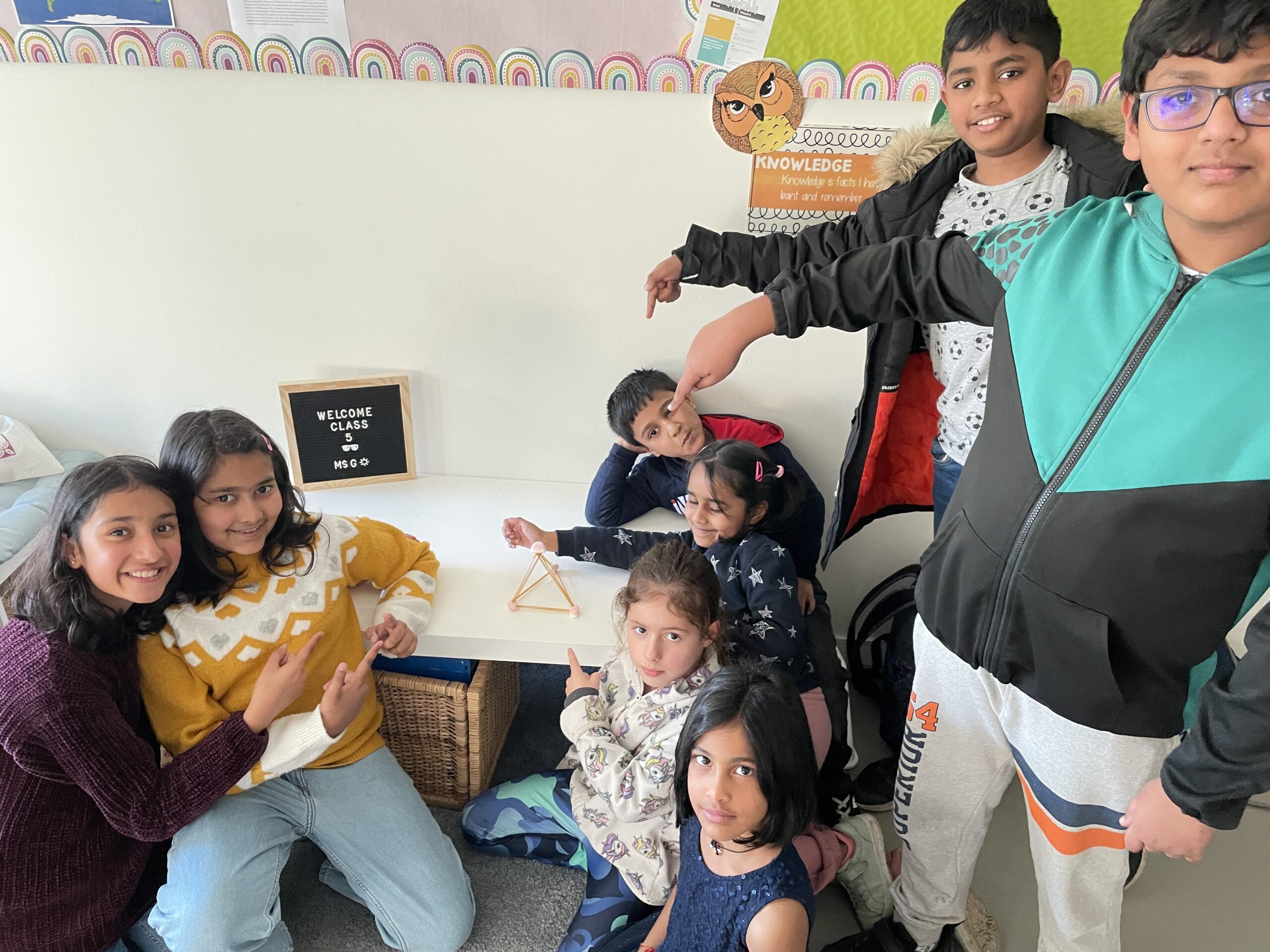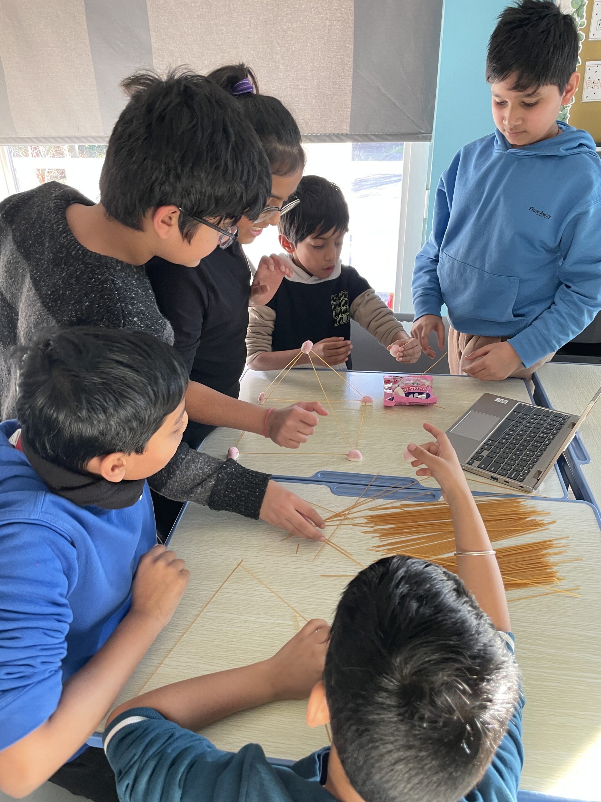 This week the students from class 1 and 5 collaborated on a team building activity. Collaboration helps children to discover each others’ strengths, interests and capabilities. Instead of limiting learning to a one way stream from a teacher or an adult to them, they can learn from each other. As a result each child can develop a unique set of skills and knowledge in a fun and efficient way. Here you can see Class 1 working along with Class 5 on a team building project where they are using spaghetti and marshmallows to make structures.