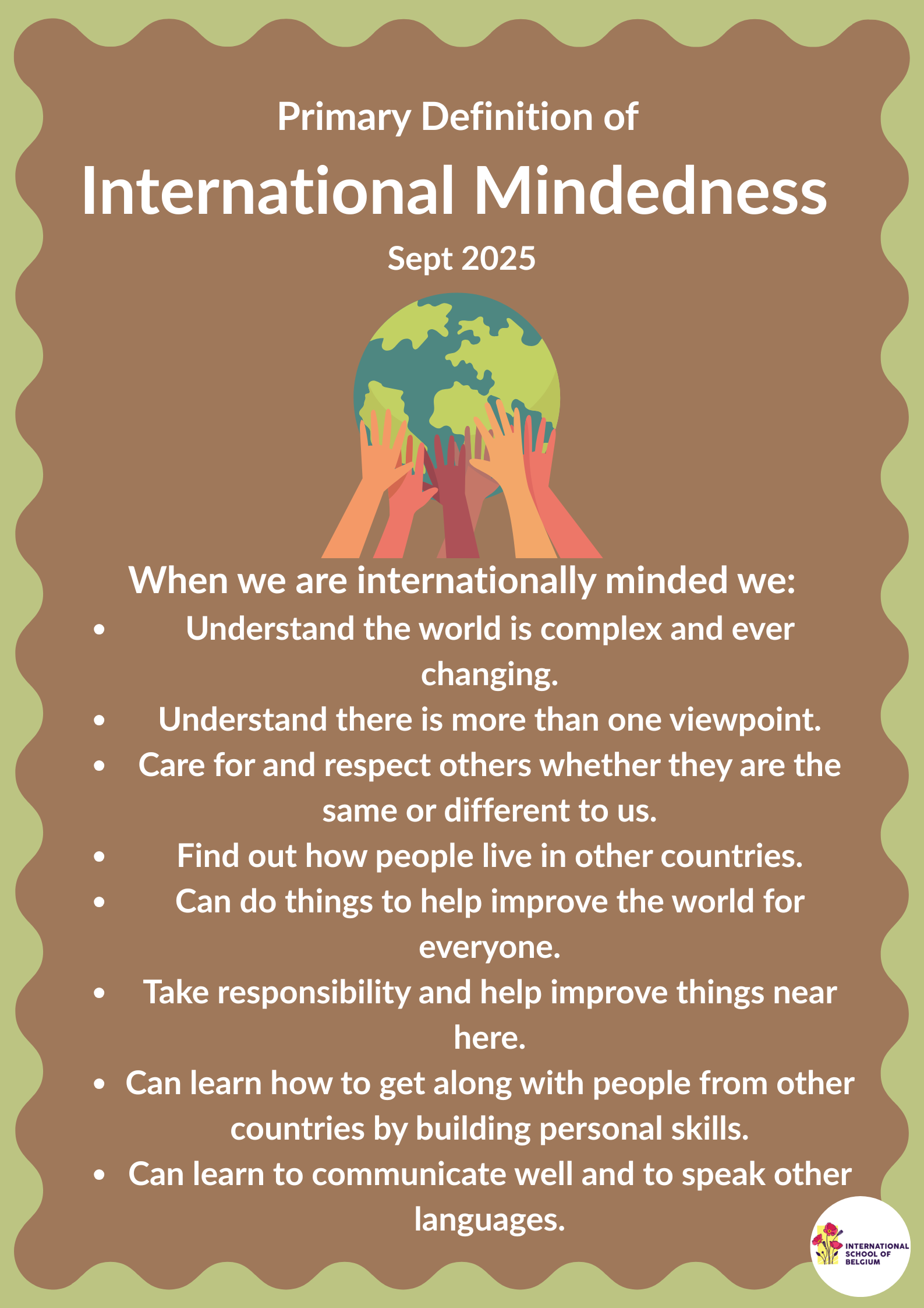 Today’s assembly was about International mindedness, a key component to our curriculum here. We discussed our primary definition and what it means. Tolerance of others is a big component of this.