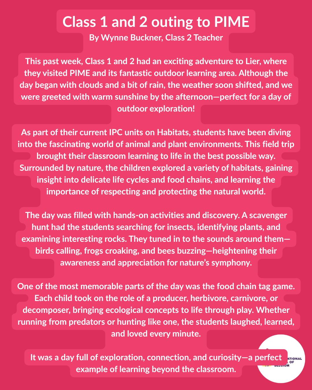 Class 1 and 2 went to PIME outdoor centre in Lier for their class trip. They were looking at habitats, especially wetland ones, and PIME has some marshy areas and wildlife ponds which allowed them to really find out a lot. They were also able to play games related to their learning and I am told by the teachers nobody wanted to leave! Now that’s a sign of a great trip.