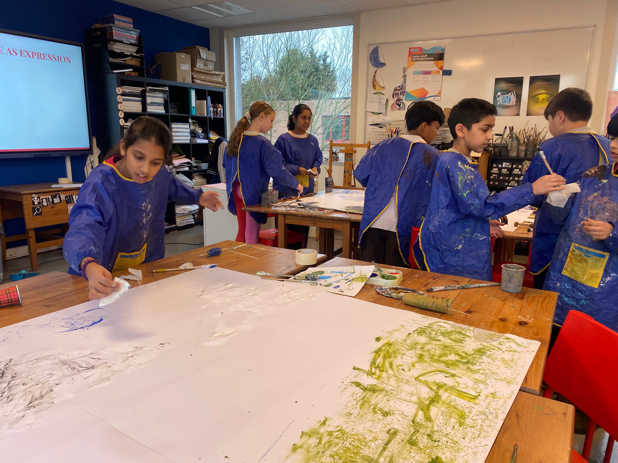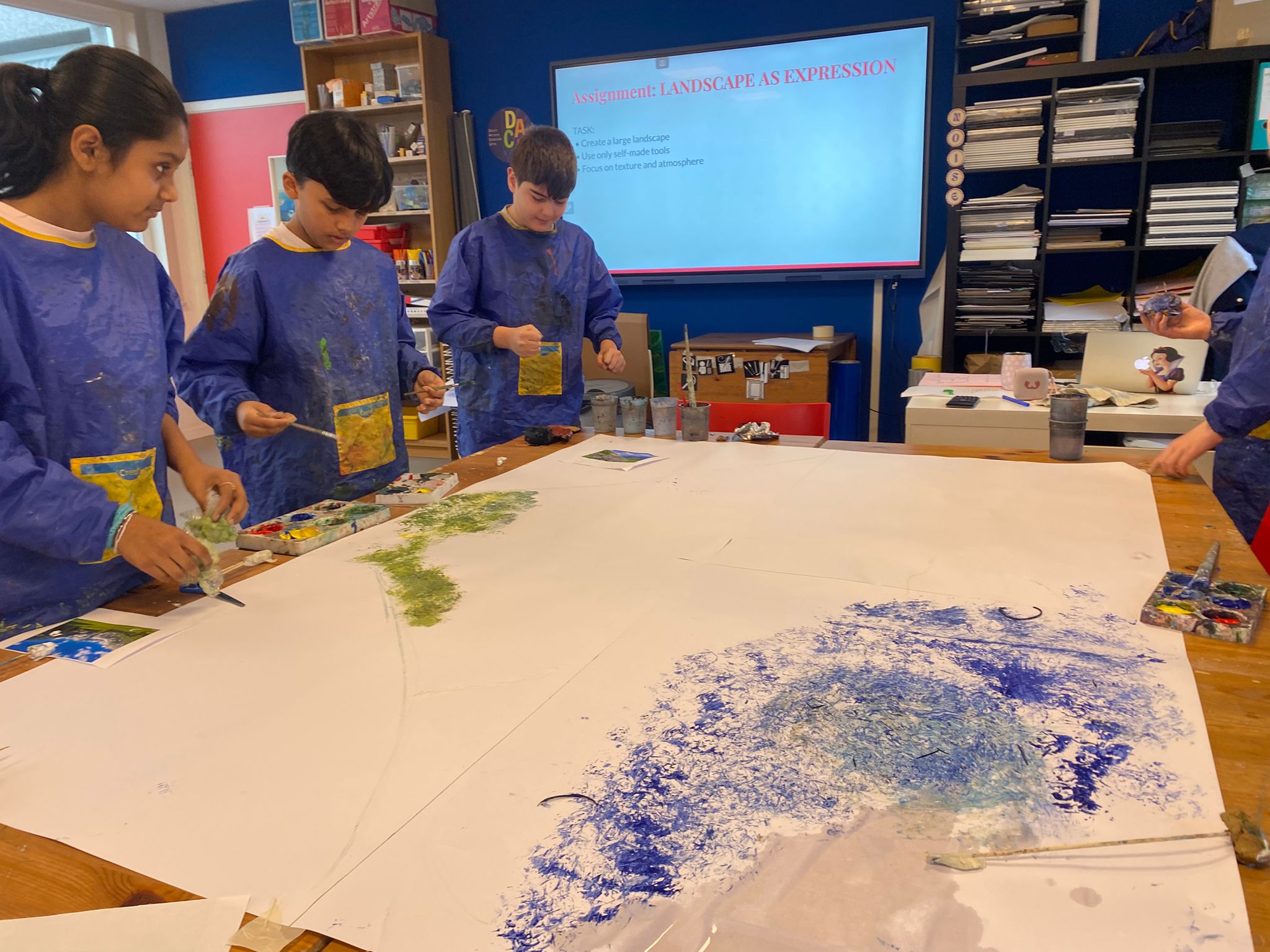 Art with Class 5 has been full of imagination, exploration and making this term. We travelled through the galaxy, explored emotions through expressive portraits inspired by Marlene Dumas, and discovered the flowing lines and nature-inspired designs of the Art Nouveau period. In our current project, Making Materials, the class has been travelling the world and its history through art. Pupils explored textiles and weaving inspired by Anni Albers and Aboriginal traditions, and looked at artists such as Sheila Hicks, Giuseppe Penone and William Kentridge, discovering how artists use natural, recycled and unexpected materials to tell stories. In today’s lesson, everyone worked together on a large-scale landscape using tools they had made themselves. Inspired by Anselm Kiefer, pupils experimented with texture, layers and bold mark-making to create a dramatic shared artwork. Class 5 has shown fantastic curiosity, teamwork and creativity, learning that art is not just about the final result, but about experimenting, discovering and enjoying the process.